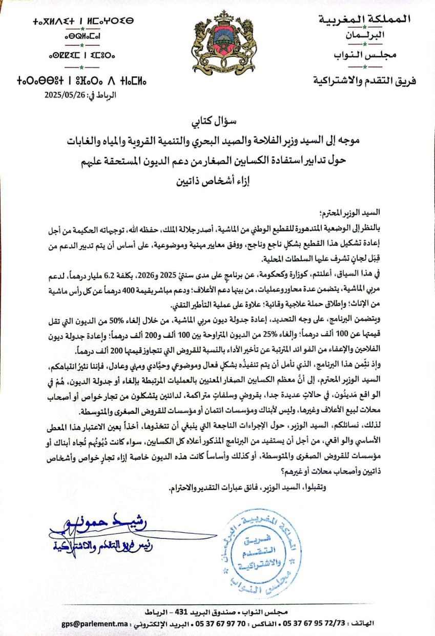 سؤال كتابي من الرفيق رشيد حموني إلى وزير الفلاحة حول دعم الديون المستحقة على الكسابين الصغار لفائدة أشخاص ذاتيين
