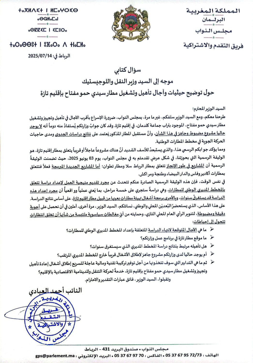 أحمد العبادي يوجه سؤالاً كتابياً إلى السيد وزير النقل واللوجيستيك بشأن توضيح حيثيات وآجال تأهيل وتشغيل مطار سيدي حمو مفتاح بإقليم تازة.